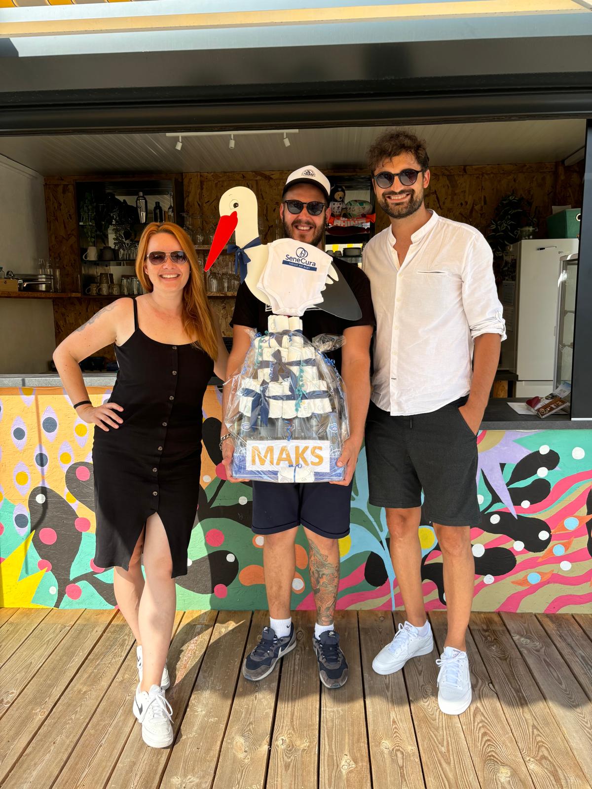 Der Storch landetet im August in Slowenien beim Mitarbeiter des SeneCura Sozialzentrums Söchau, Manuel. Er wurde zum zweiten Mal Papa und das gesamte Team gratuliert herzlich zum Familienzuwachs. Mit einem Willkommensgeschenk wurde Maks begrüßt und alle haben auf seine Geburt angestoßen.
